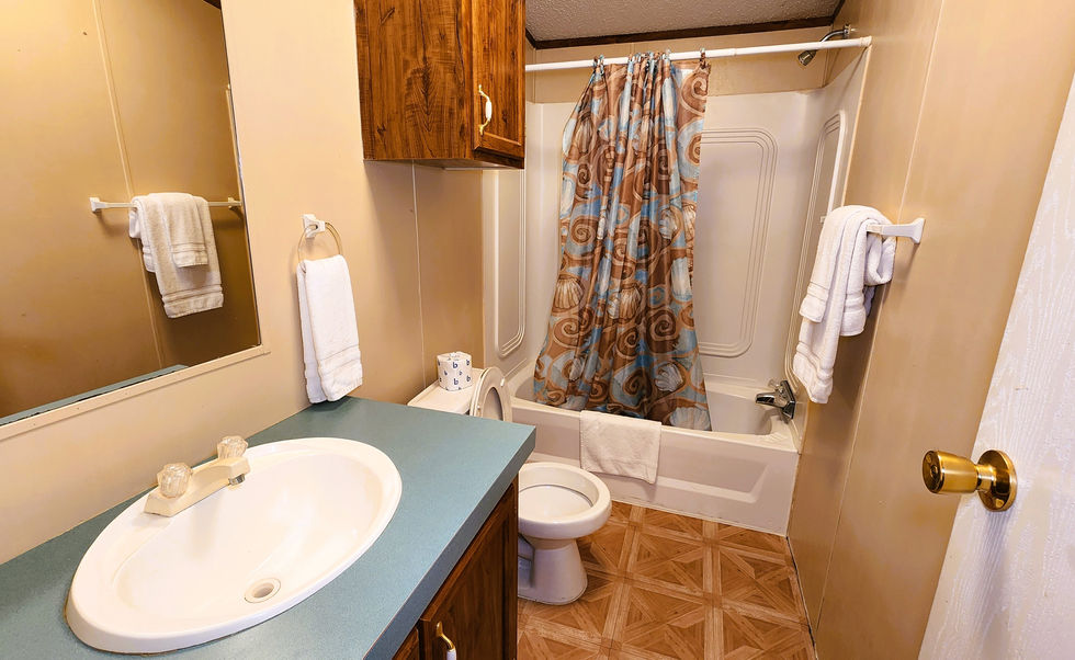 This cozy mobile home–style cabin features two comfortable bedrooms—a master with a queen-size bed and a second bedroom with a bunk bed featuring two full-size beds. With two full bathrooms and beautiful lake and pool views, this spacious, homey cabin is perfect for guests seeking a relaxing and comfortable stay by the water.